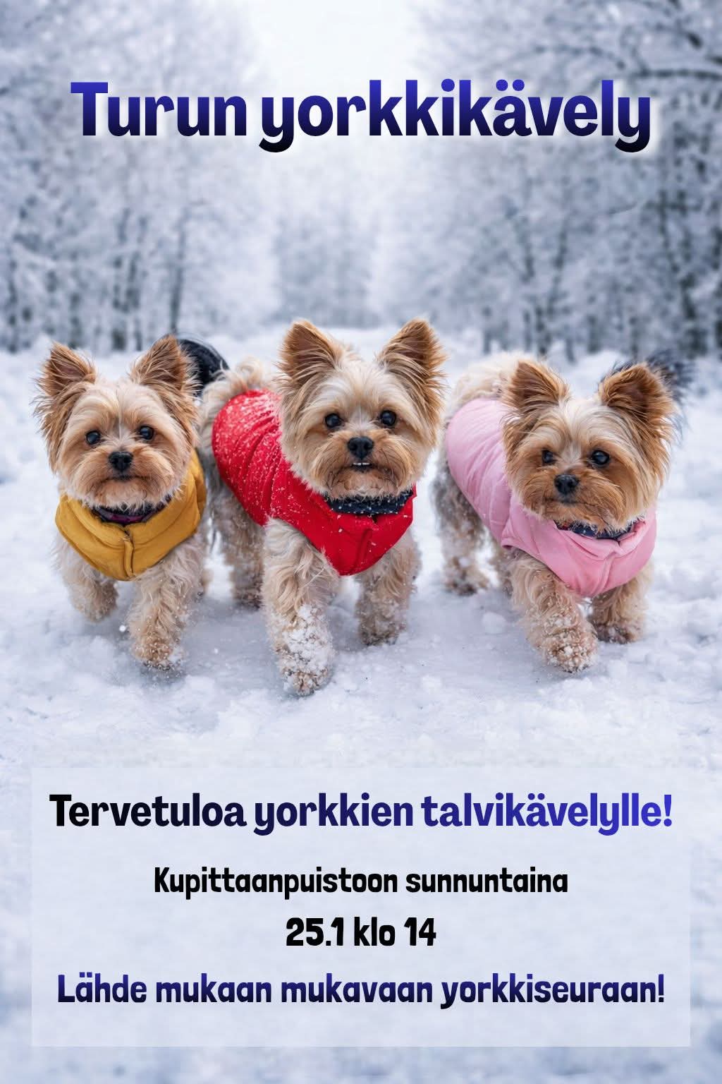 Yorkkitreffit – Turku 🐕 Yhdessä on hauskempaa! 💙 📍 Kupittaanpuisto, Turku 🗓 25.1. ⏰ klo 14 Tervetuloa mukaan nauttimaan ulkoilmasta, seurasta ja iloisista tassuista! 🐾